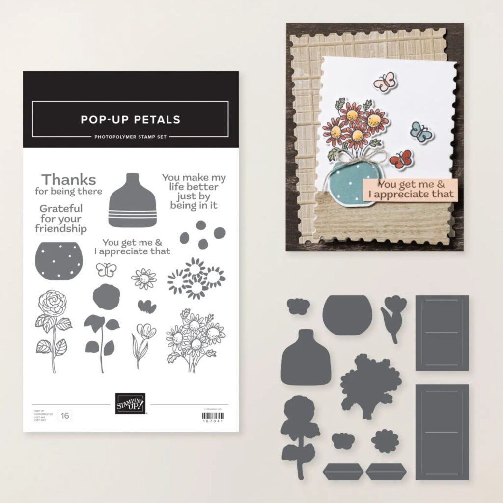This month, we used the Pop-Up Petals stamp and die bundle to create 16 different designs. Here is a sneak peek at my card. To see the rest, get the class!
