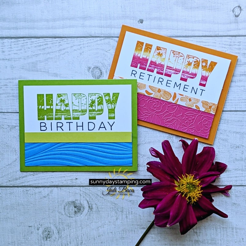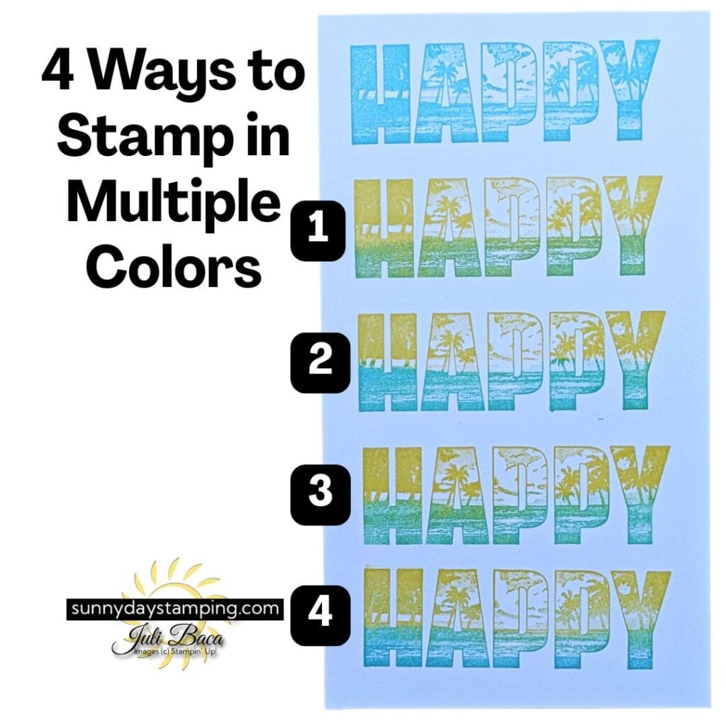 I used Stampin’ Up!’s Happy Place stamp set for all the cards shown, and it’s such a fun set to play with! With that big bold stamp, it makes card making super quick. Scroll down to learn 4 techniques for adding multiple colors to that stamp.